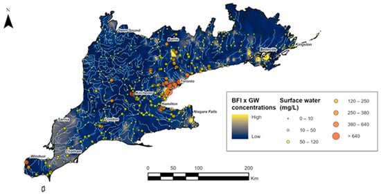 This study maps and analyzes Cl− concentrations in both groundwater and surface water across southern Ontario for two decadal periods (2001–2010 and 2011–2020) by plotting monitoring data and generating spatial interpolations using inverse distance weighting (IDW). This approach supports the visualization and investigation of spatio-temporal variability in Cl− concentrations. This study further evaluates how identified Cl− hotspots correspond to landscape characteristics by applying a novel composite vulnerability index (SL-SG-LU), which integrates slope (SL), surficial geology (SG), and land use (LU) across broad spatial scales. This index is assessed at both the regional scale (southern Ontario) and the watershed scale (Credit River), and its performance is compared to the widely used DRASTIC-LU (after [20]) method. In addition, this study explores relationships between baseflow contributions and surface water Cl− concentrations, particularly in areas identified as having elevated groundwater vulnerability.