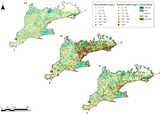 The weighted overlay analysis was carried out using the raster calculator (spatial analyst tool) in ArcGIS Pro software. To preprocess the data for the analysis, the cells in the three raster layers were reclassified based on their relative weight from 1 to 10. This ensures that the data are scored to the same scale. Higher scores reflect a stronger influence of that parameter on Cl− vulnerability in this region. The reclassified map layers can be found in the Supplementary Material Figure S3.