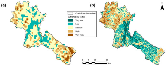 The relationship between the observed groundwater Cl− concentrations (2011–2020, n = 101) and the vulnerability indices generated from the two analyses of the Credit River watershed was assessed using Pearson’s correlation coefficient. This coefficient, which ranges from −1 to +1, indicates both the strength and direction of the correlation. It is important to note these indices are intended as screening tools, not precise predictive models.