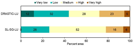 The DRASTIC index evaluates groundwater vulnerability using seven hydrogeological parameters: depth to water (D), net recharge (R), aquifer media (A), soil media (S), topography (T), impact of the vadose zone (I), and hydraulic conductivity (C) [20]. A land use (LU) modifier layer was added to reflect Cl−-specific anthropogenic pressures (e.g., from road salting, agriculture, and industrial activities), following [53]. Each parameter was weighted and rated based on standard DRASTIC values, the details of which are summarized in Table 2. The LU layer was classified using the same categories and scores as in the SL-SG-LU method, reflecting the influence of anthropogenic activity on Cl− contamination, particularly in urbanized areas. All parameter weights were based on DRASTIC guidance [20]. The resulting vulnerability index was computed as follows (Equation (3)):