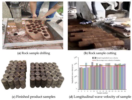 The sandstone samples exhibited a dark red color, and the rock products underwent analysis using a D/max-2500 X-ray diffractometer (Rigaku Corporation, Tokyo, Japan). This process identified the primary mineral compositions as quartz, plagioclase feldspar, potassium feldspar, calcite, and montmorillonite, with respective content percentages of 48.9%, 22.9%, 10.7%, 6%, and 6%. Adhering to the geological characteristics of the Xinzhuang coal mine ventilation shaft project and the on-site sampling protocols outlined in “Method for Sampling Coal and Rock Samples” (GB/T 19222) [47] and “Method for Determining the Mechanical Properties of Coal and Rock” (GB/T 23561.1-2009) [48], the samples were processed. In the laboratory, the rock samples underwent coring, cutting, and polishing to transform them into standard specimens measuring ϕ 50 mm × 100 mm, as shown in Figure 2. The processed standard rock samples were then subjected to acoustic wave testing to minimize errors from sample dispersion. The acoustic wave tests were conducted using a UTA-2000A ultrasonic testing analyzer (Hebei Jingwei Test Instrument Co., Ltd., Shijiazhuang, China), with 50 specimens tested. The longitudinal wave velocity of the specimens ranged from 1671 to 2038 m/s, with an average value of 1867 m/s and a dispersion coefficient of 1.978%. Rock specimens near the average longitudinal wave velocity were chosen for the creep test of saturated frozen sandstone.