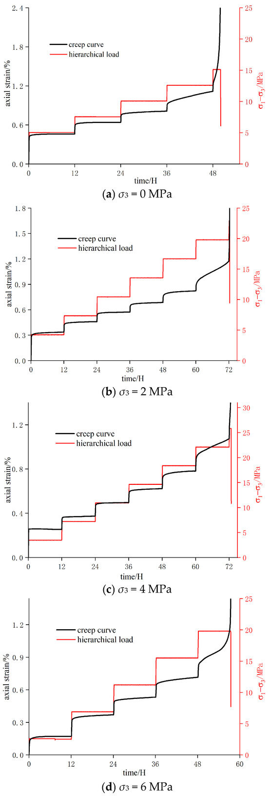 Creep test specimens are dried in an oven at 105 °C for a minimum of 24 h. Subsequently, dry sandstone is vacuum-saturated in a vacuum saturator for a minimum of 12 h. Before loading the samples into the pressure chamber, the surface of the specimens is coated with Vaseline to reduce moisture migration during the process of specimen water evaporation and cooling, ensuring the reasonable accuracy of the test. The test temperature was set at −10 °C, in accordance with the common temperature of freezing well construction, with the room temperature condition serving as the comparison group. Based on the sampling depth in the field, four confining pressures of 0 MPa, 2 MPa, 4 MPa, and 6 MPa were established. The creep test was conducted following these steps: ① After loading the samples and injecting oil, the cryogenic system was adjusted to freeze the pressure chamber at a rate of 10 °C per hour. Once the test temperature was reached, the temperature was held constant for 8 h to ensure the uniform internal temperature of the rock samples. ② Under stress control mode, confining pressure was applied according to the condition σ1 = σ2 = σ3, and the system was stabilized for 2 min. ③ With the confining pressure maintained, loading was performed in steps of 20%, 30%, 40%, 50%, 60%, 70%, 80%, and 90% of the peak strength obtained from conventional tests, with each level of the loading set at 10% of the peak strength, as shown in Table 1. Each loading stage lasted 12 h, with a loading rate of 0.05 MPa per second, to eliminate the impact of the loading rate on the test results. The loading process continued until the frozen sandstone was destroyed, while the temperature of the rock sample bin was consistently maintained at the set temperature.