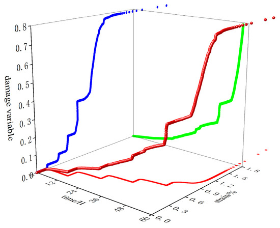 The rule governing the change in damage variables of frozen sandstone can be determined using the measured data. Figure 7 illustrates the three-dimensional variation in damage variable D over time and strain in frozen sandstone at −10 °C and under a confining pressure of 6 MPa. The diagram reveals that the blue curve exhibits slow changes initially, which corresponds to the decay creep stage. During this phase, internal natural microcracks gradually close due to external forces, and the damage variable experiences a slight increase. The green curve suggests that upon entering the steady deformation stage, the continuous application of axial stress facilitates the gradual formation of new microcracks and an increased rate of damage variable growth. The red curve represents the accelerated creep stage, where the damage variable rises sharply, cracks expand and propagate rapidly, and the damage ultimately reaches its peak, Dmax, signaling the onset of creep failure. The distinct color curves distinctly reflect the evolution trend of damage variables across each creep stage and validate the rationality of the damage evolution law.