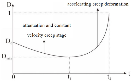 Points t1 and t2 in Figure 8 represent the onset of rock creep into the accelerated stage and the end of final creep damage, respectively. The nonlinear characteristics of rocks during the creep process render the linearization of traditional combined models ineffective in accurately describing the phenomenon. By incorporating a damage variable into the creep process of rocks, the entire creep process can be effectively described, a fact that has been confirmed in the existing literature. The concept of the damage variable was initially introduced in the field of injury mechanics, with the more commonly used being the damage variable evolution equation proposed by Kachanov [49]: