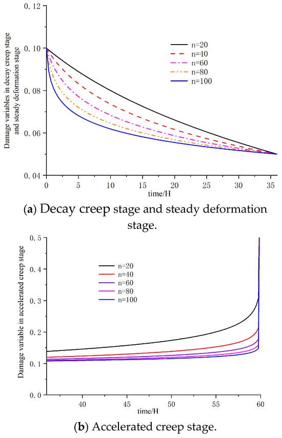 Figure 9 depicts the evolution of damage variable D for extreme values of the damage evolution exponent, n. The results show that throughout the attenuation and steady-state creep phases, larger values of n correspond to faster damage restoration within the same time interval. Conversely, during the accelerated creep phase, smaller values of n result in a more rapid accumulation of damage over time. These observations suggest that as the stress level increases, the rock material undergoes more severe damage, especially upon entering the accelerated creep phase, where the propagation and interconnection of microcracks significantly intensify the damage process.
