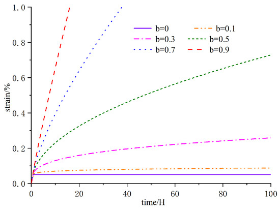 As shown in Figure 10, when the creep stress remains constant, the fractional-order viscous body, as previously suggested, exhibits nonlinear creep characteristics. Notably, as the value of β increases, the creep characteristics become more pronounced. For lower values of β, the change in creep is minimal, whereas for higher values, the change in creep becomes significantly larger. These results highlight that β governs the order of the fractional derivative, and adjusting its value allows for an accurate description of the nonlinear asymptotic creep process.
