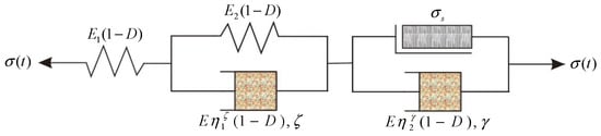 In the figure, E1 and E2 represent the modulus of elasticity, Eη1ζ and Eη2ζ represent the coefficient of viscosity, σs represents the yield strength of sandstone, D is the damage value, ζ is the fractional derivative order of a fractional-order viscous body, and γ is the fractional derivative order of a fractional-order viscoplastic body.
