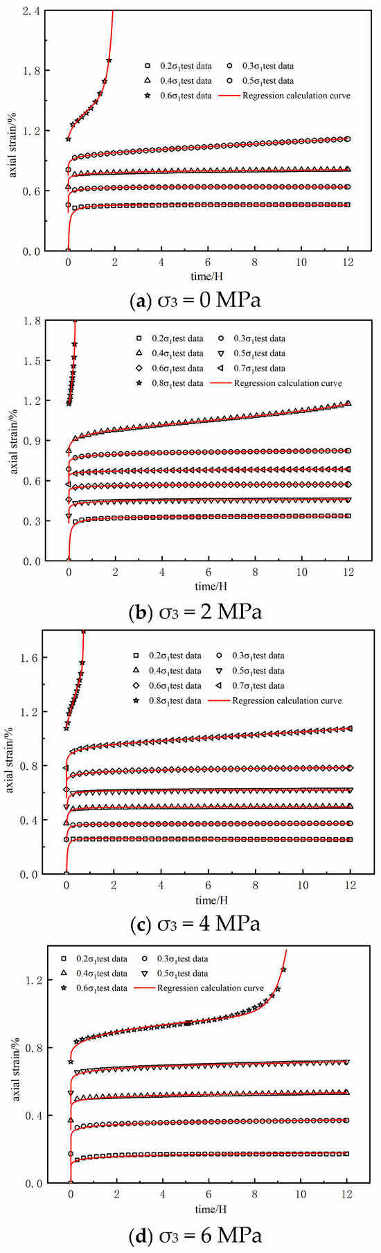 Based on the creep test analysis presented in Figure 13, the experimental results demonstrate stress-dependent dual-phase creep behavior. As the applied stress increases, a corresponding incremental strain response is observed. Notably, when the applied stress is below the long-term strength threshold, higher stress magnitudes correlate with extended durations in the stable creep phase. Conversely, when the applied stress exceeds the long-term strength limit, increased stress levels result in shortened stable creep durations and more rapid transitions to accelerated creep regimes.
