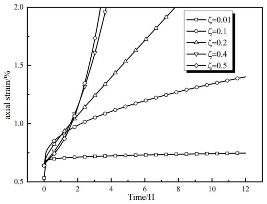 Figure 14 illustrates that as the order of fractional-order derivative ζ increases, creep deformation tends to increase. When ζ is less than 0.1, the creep process enters the plateau stage after a relatively short period, with minimal deformation. In contrast, when ζ exceeds 0.1, creep deformation experiences a substantial increase after a short time, leading to the accelerated creep stage.