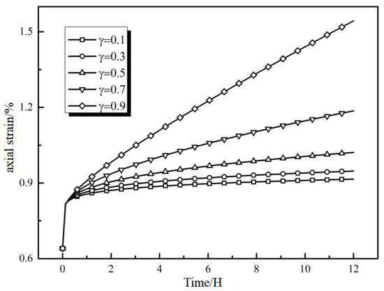 When keeping the parameters’ relaxation unchanged, by solely modifying the order of the fractional-order by-product γ to γ = 0.1, 0.3, 0.5, 0.7, 0.9, a set of creep curves with distinctive γ values can be obtained, as demonstrated in Figure 15.