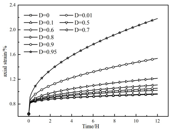When all other parameters remain constant and only the damage variables are altered, for instance, by setting D to 0, 0.01, 0.1, 0.5, 0.6, 0.7, 0.8, 0.9, and 0.95, a series of creep curves corresponding to these different damage variables can be obtained, as illustrated in Figure 16.