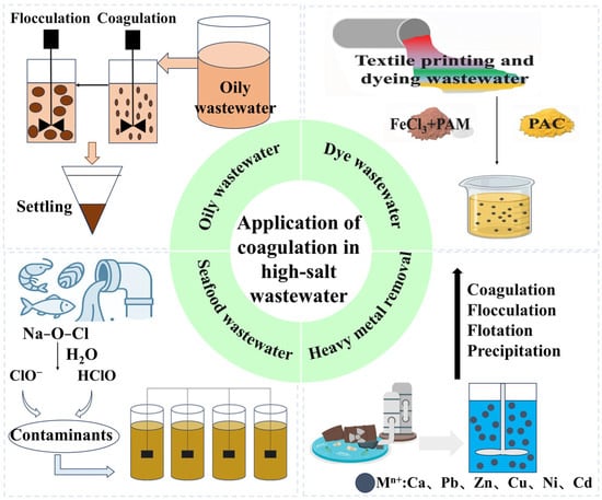 A popular pretreatment method for removing suspended solids, colloids, organics, and certain heavy metal ions from different kinds of water is coagulation–flocculation technology (Figure 1). The method is crucial for treating high-salt wastewater, even though it cannot considerably lower the salt content of wastewater on its own. Effective removal of COD, turbidity, and oil and grease from wastewater using coagulation–flocculation can help to reduce the organic loading of the subsequent biological or physicochemical treatment system, as well as to improve the overall treatment stability and efficiency. This is because colloidal particles in wastewater are more stable in high-salt environments due to electrostatic shielding, which makes direct biological treatment more challenging.
