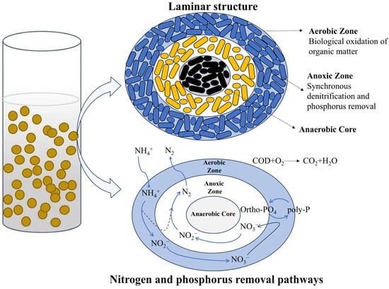 Because of its dense structure, good sedimentation, and salt tolerance of dominant bacterial groups, aerobic granular sludge (AGS) has gradually shown its potential for use in high-salt wastewater treatment, despite the fact that high-salt environments present a challenge to conventional aerobic systems (Figure 2). Its capabilities include biosorption, nitrogen and phosphorus removal, and organic matter degradation, all of which offer a viable route for the effective biological treatment of high-salt wastewater. Corsino et al. [45] looked into the viability of treating canned fish wastewater by simultaneously nitrifying and denitrifying aerobic granular sludge. Both processes were successful when the mass concentration of NaCl was 50 g/L and the effluent’s total nitrogen content was less than 10 mg/L. The nitrification system failed when the salinity exceeded 50 g NaCl/L. The organic carbon removal efficiencies were up to 90% under all of these conditions, which is consistent with the previous periods. The sludge retention time was 45–50 days. In contrast, organic removal was influenced by the organic loading rate (OLR) rather than salinity. The influent flow rate and OLR were cut in half when the reaction cycle length was doubled to distinguish between the effects of high salinity and OLR. More than 95% of particulate organic matter could be eliminated by aerobic granular sludge, and both COD and BOD removal rates were higher than 90%.