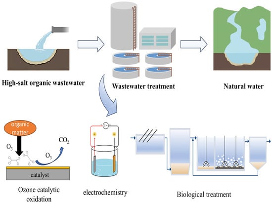 One of the main sources of pollution affecting regional water ecological security and sustainable use of water resources is the increasing discharge of high-salt wastewater brought on by the acceleration of industrialization and urbanization. Numerous industries, including petrochemical, pharmaceutical, printing and dyeing, food processing, tanning, electronic plating, and others, produce large amounts of high-salt wastewater. One of its common characteristics is the high concentration of soluble inorganic salts (e.g., SO42−, Ca2+, Mg2+, NaCl, etc.), as well as highly toxic, complex, and hard-to-degrade organic pollutants like emulsified fats and oils, surfactants, pigments, residual medications, and aromatic hydrocarbons. Wastewater is categorized as high-salt wastewater when the mass fraction of inorganic salts reaches 1–3.5% [1]. Its osmotic pressure is significantly higher than that of typical water bodies, which can coerce aquatic organisms and upset the ecosystem’s equilibrium. Furthermore, if released into the environment untreated, some high-salt wastewater will cause major environmental issues, like water mineralization, eutrophication, and soil salinization, due to its high chemical oxygen demand (COD, which can reach thousands of mg/L), significant pH fluctuations, and toxicity.