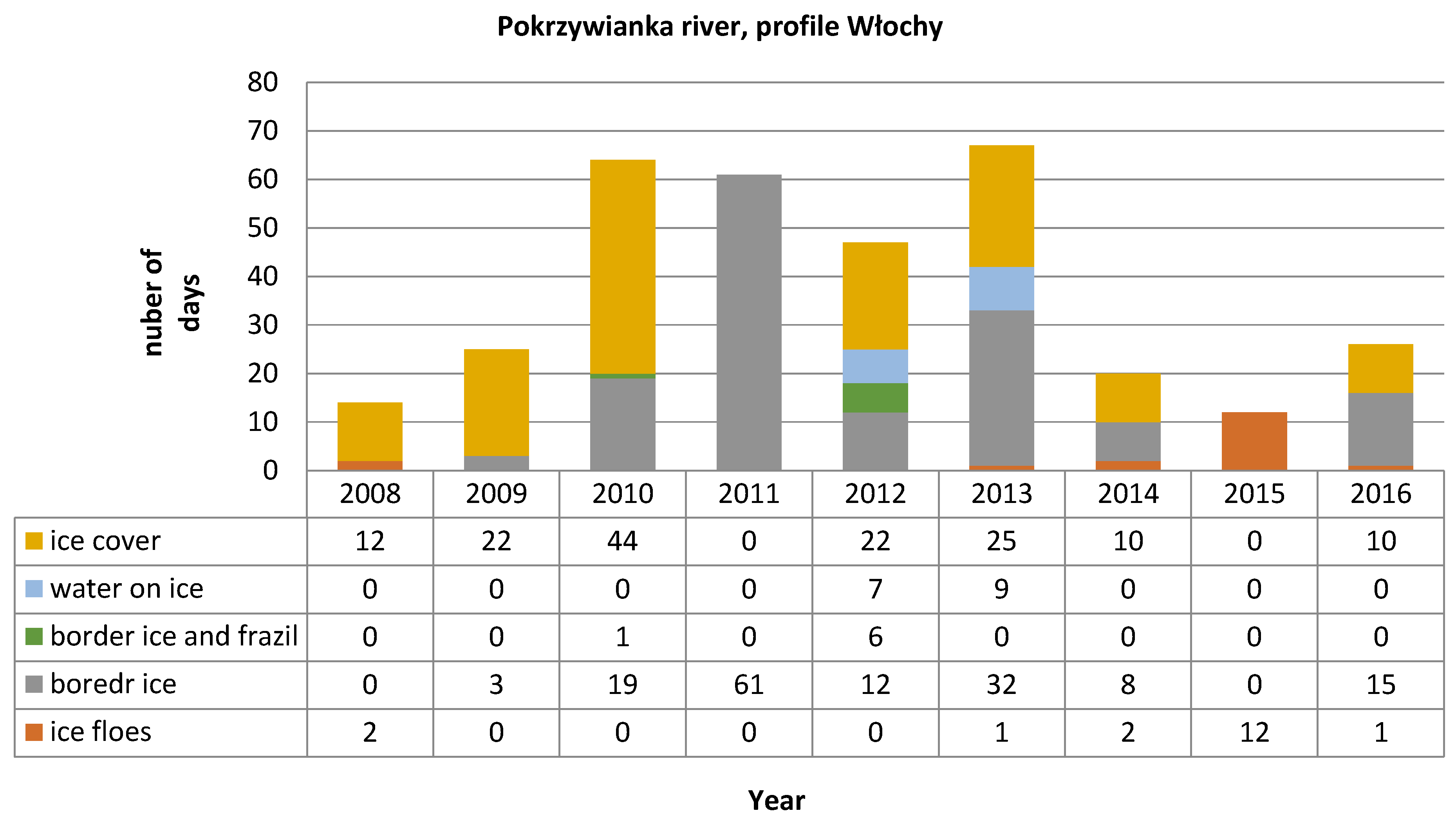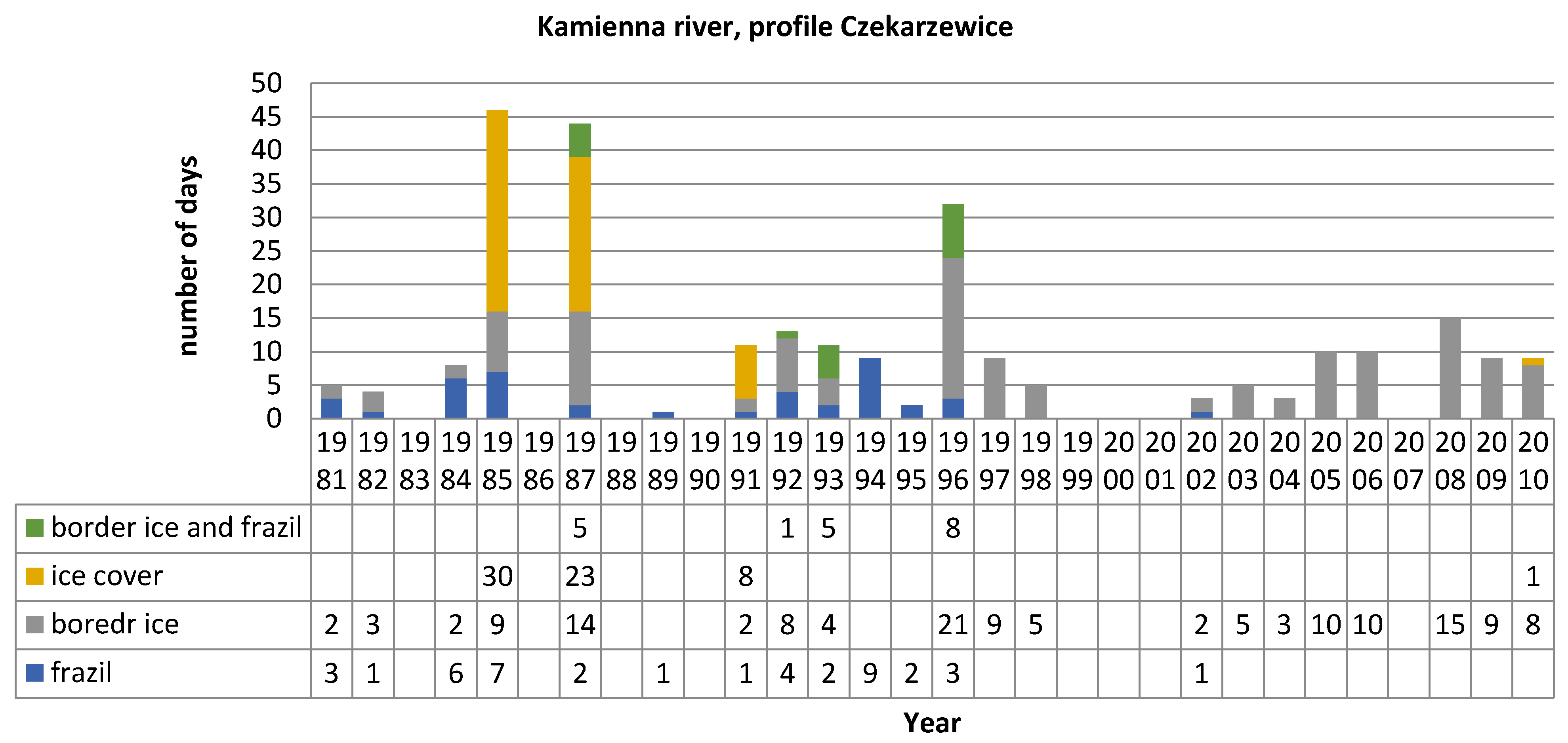 - Kochanek, K.; Grygoruk, M.; Mirosław-Świątek, D. The Disappearance of Ice Phenomena in the Rivers of Southern Poland. In Współczesne Problemy Gospodarowania Zasobami Wodnymi; Monografie Komitetu Gospodarki Wodnej Polskiej Akademii Nauk: Warszawa, Poland, 2022; Volume 45. [Google Scholar]