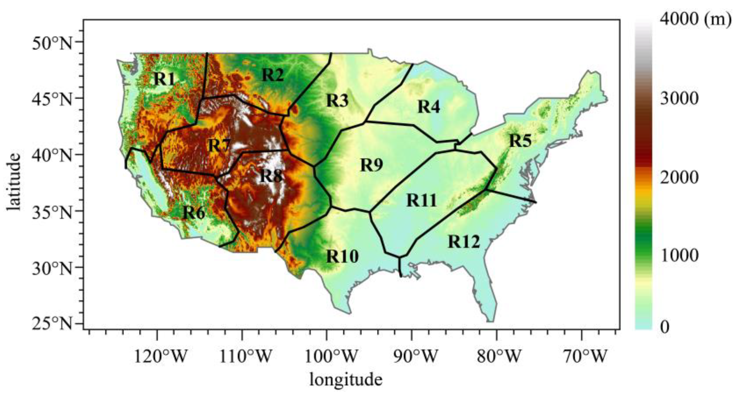 - McRoberts, D.B.; Nielsen-Gammon, J.W. A New Homogenized Climate Division Precipitation Dataset for Analysis of Climate Variability and Climate Change. J. Appl. Meteorol. Climatol. 2011, 50, 1187–1199. [Google Scholar] [CrossRef]
