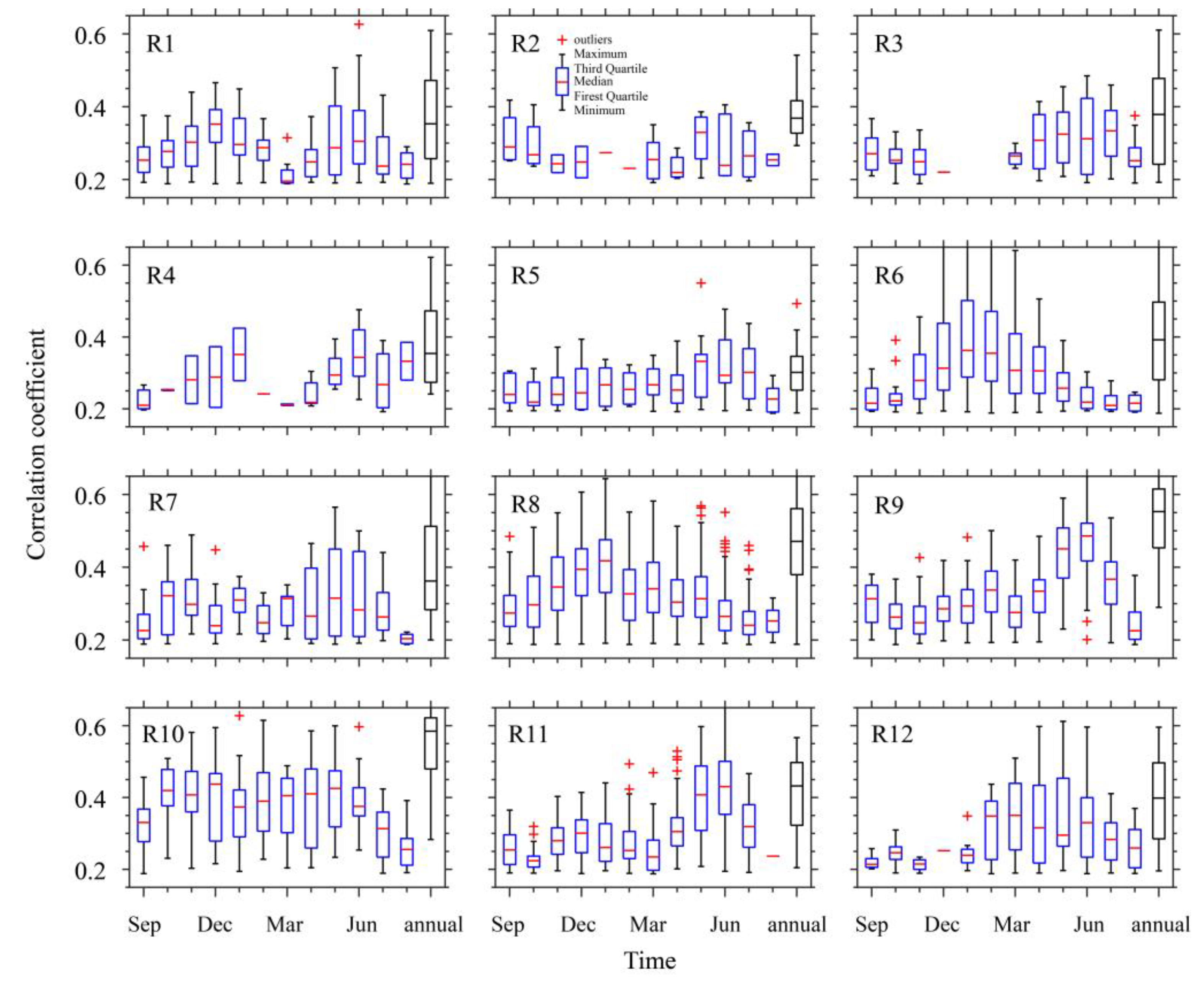 3.2. Temporal–Spatial Variations in Decadal Variability