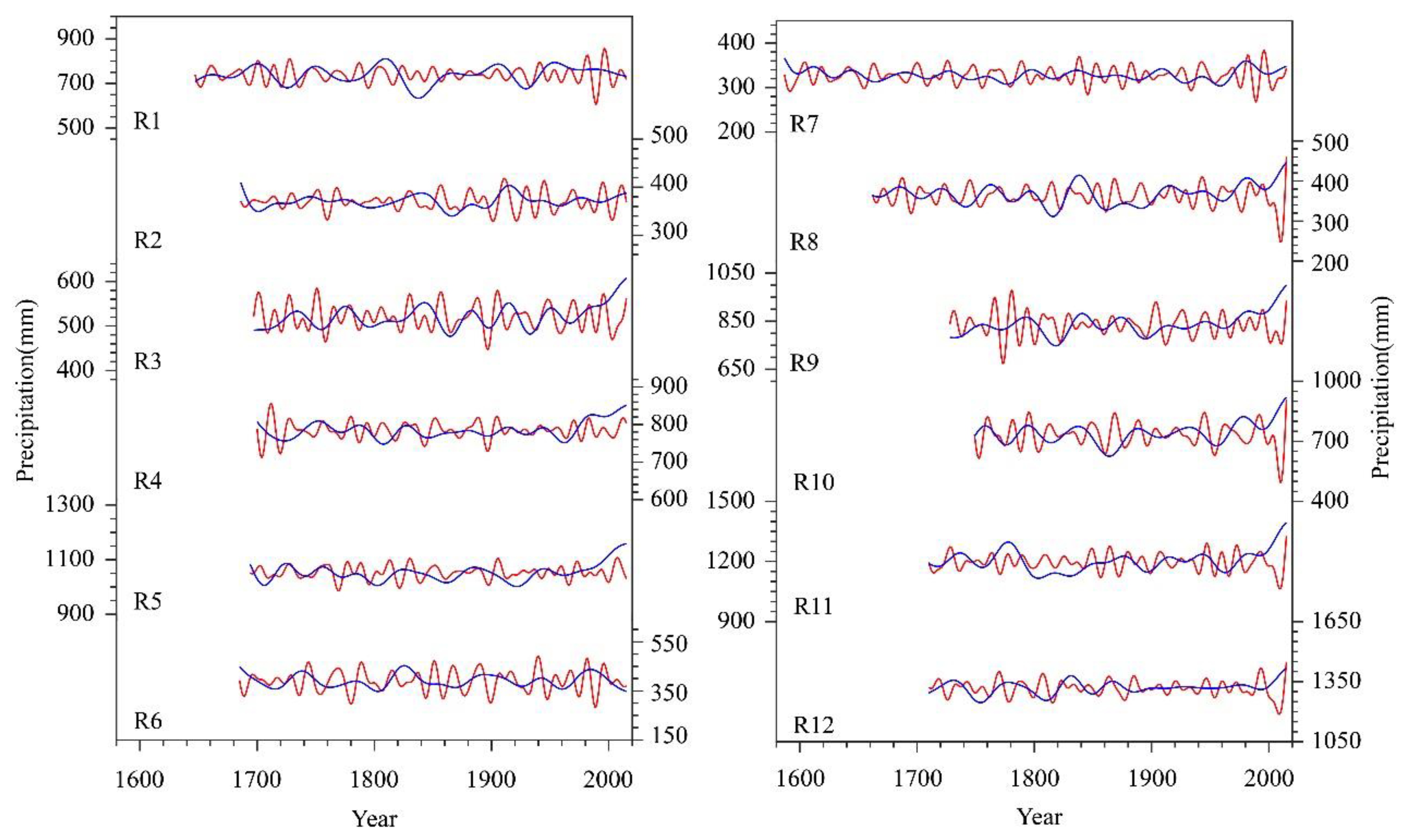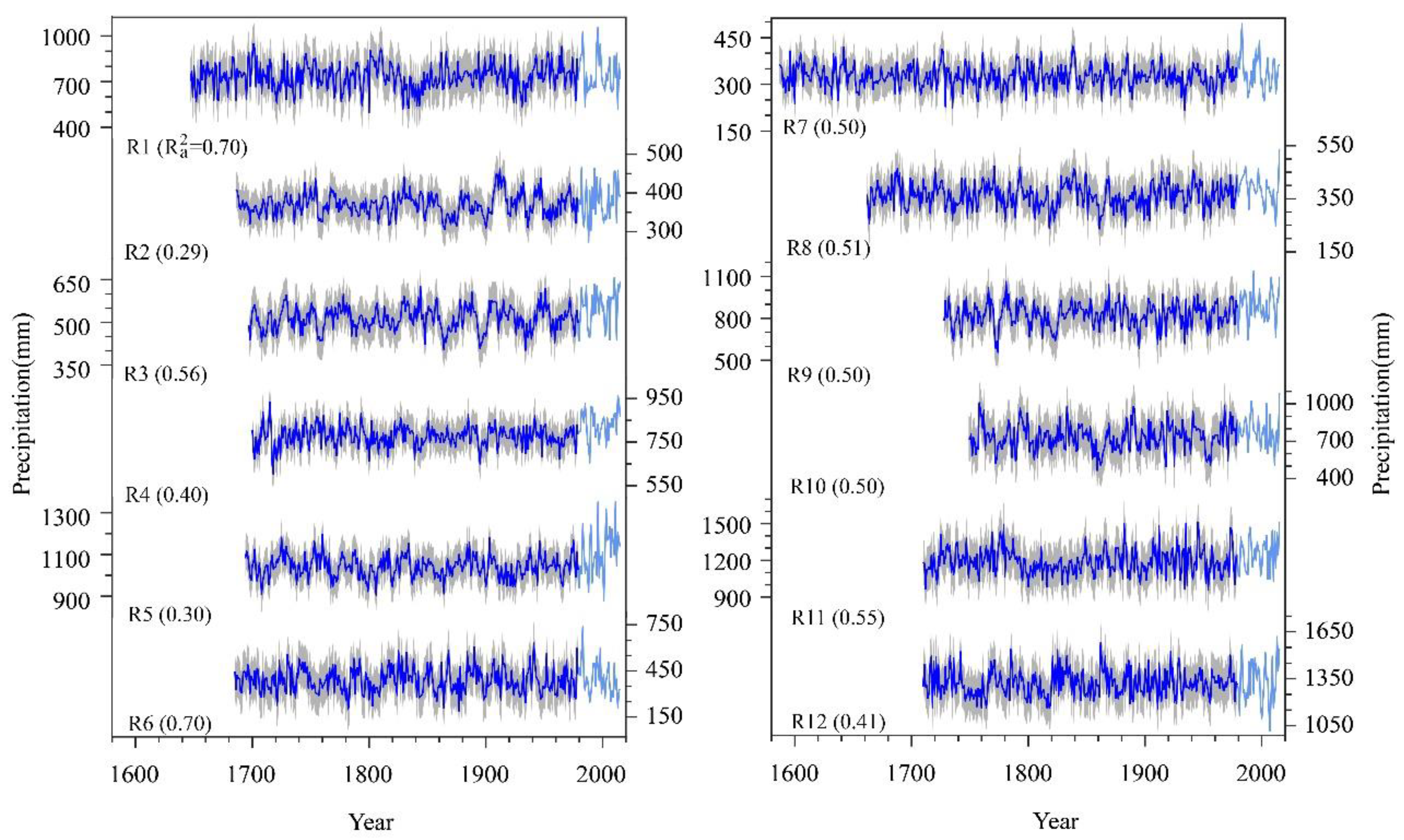 - Bai, M.X.; Hao, Z.X.; Zhang, X.Z.; Zheng, J.Y. A dataset of tree-ring-based regional precipitation reconstruction in the United States during the last millennium. China Sci. Data 2021, 6, 3. [Google Scholar] [CrossRef]