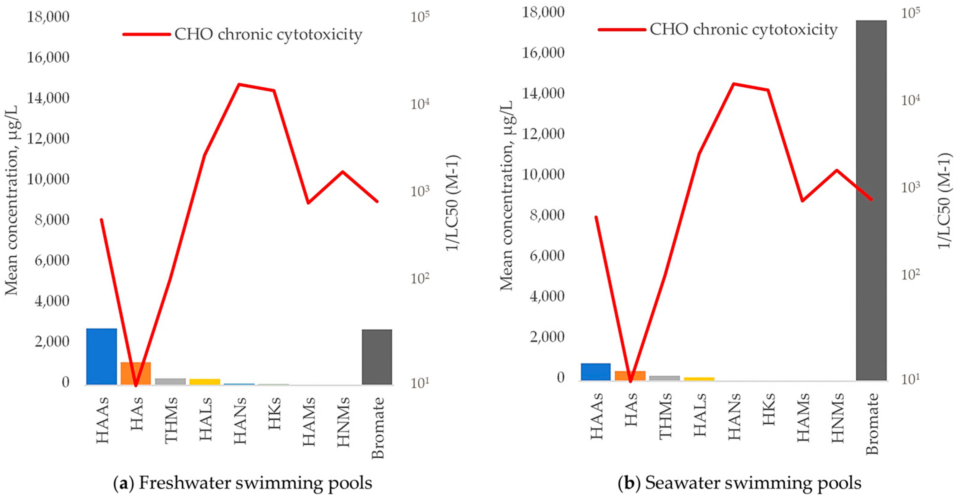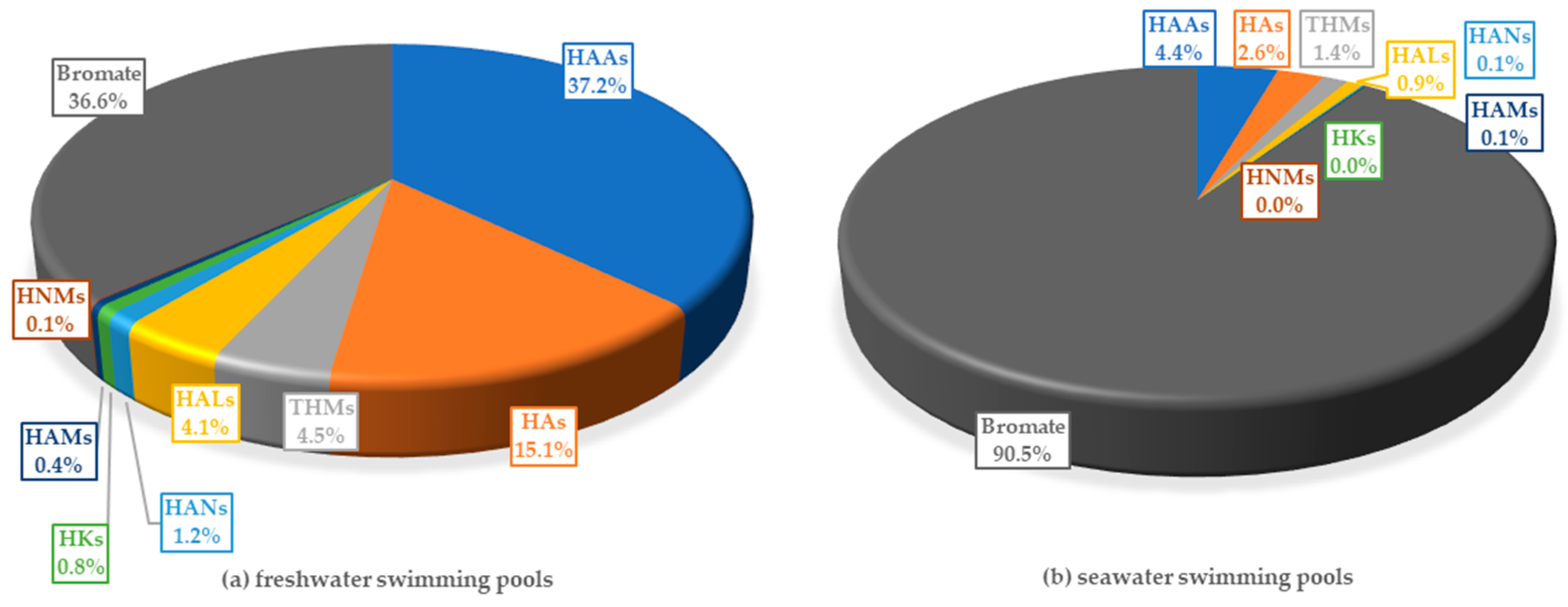 - Zhang, D.; Dong, S.; Chen, L.; Xiao, R.; Chu, W. Disinfection byproducts in indoor swimming pool water: Detection and human lifetime health risk assessment. J. Environ. Sci. 2023, 126, 378–386. [Google Scholar] [CrossRef] [PubMed]