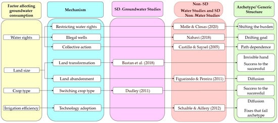 In this paper, we reviewed system dynamics–groundwater (SD–GW) models, disaggregated them into constituent sub-models, compiled these components into a structured library, and explained each sub-model using generic structures and archetypes to enhance understanding, memorability, and communication. Archetypes describe recurring patterns of dynamic behavior that appear in diverse, often unrelated contexts [40,41,42,43,44].