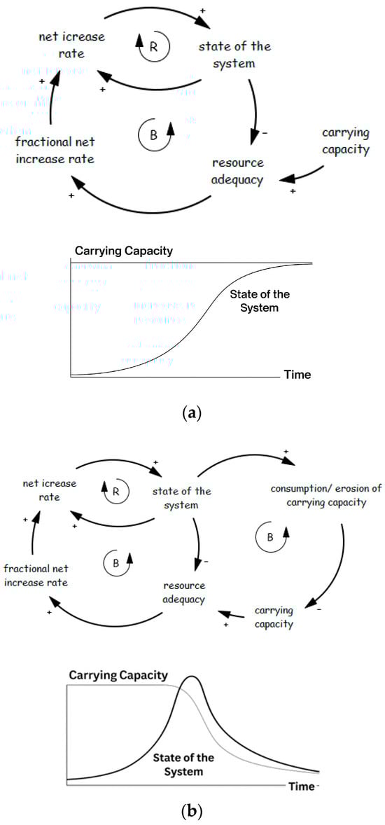 Common dynamic patterns in resource-limited growth systems [12]. (a) S-shaped growth structure and behavior adopted from Sterman [12]; (b) overshoot and collapse adopted from Sterman [12].