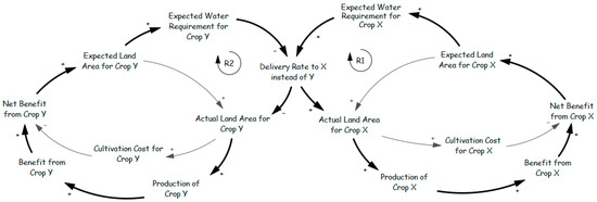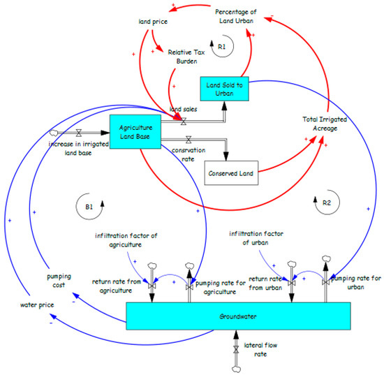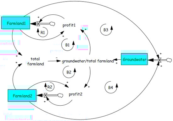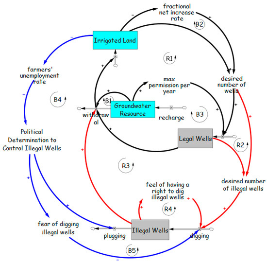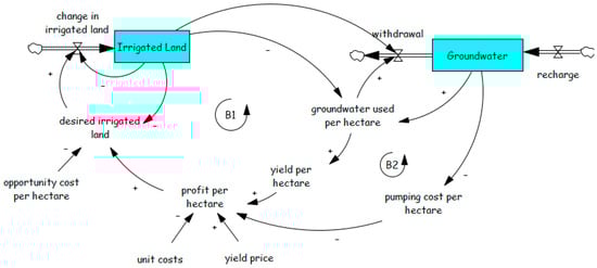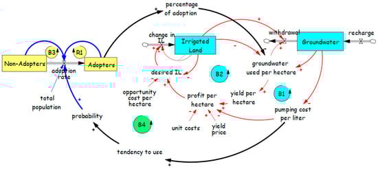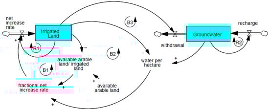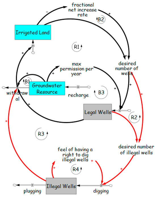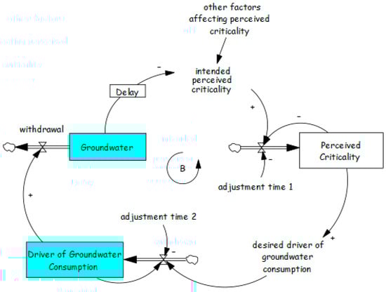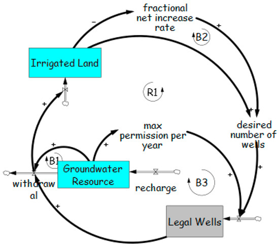 This archetype has been applied to both surface water resources [64] and groundwater [84,85,86]. Using explicit consideration of the trade-off between activity growth and resource depletion results in the model shown in Figure 8, which includes two additional balancing loops compared to Figure 7a. The additional loops B3 and B4 should help stabilize the system, but as with the Tragedy of the Commons example, however, it is dependent upon the level of understanding about aquifer characteristics.