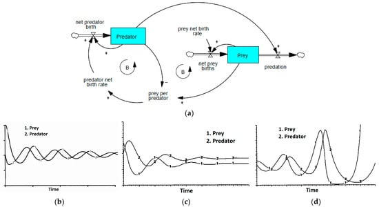 Predator–prey dynamic structure and behaviors. (a) Predator–Prey model adopted from Ford [59]; (b) stable oscillation [59]; (c) damping oscillation [71]; (d) explosive oscillation [71].