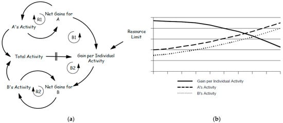 Archetype of Tragedy of the Commons. (a) Structure of the Tragedy of the Commons archetype adopted from Kim [82]; (b) behavior of the Tragedy of the Commons archetype.