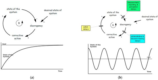 Goal-seeking and oscillatory system behaviors driven by feedback loops [12]. (a) Goal-seeking structure and behavior adopted from Sterman [12]; (b) oscillation structure and behavior adopted from Sterman [12].