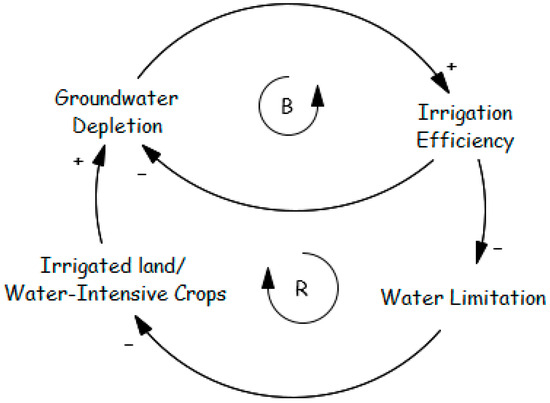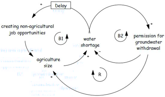 Restricting water rights is often seen as a viable solution to groundwater overexploitation. However, political concerns and potential economic and social costs make authorities hesitant to impose such restrictions, worsening the problem. This dynamic aligns with the “shifting the burden” archetype (Figure 11). Faced with water scarcity, governments typically offer two options: creating new non-agricultural job opportunities and reducing farm size [93,94,95,96,97] or, alternatively, ignoring groundwater concerns and continuing to permit new wells to meet agricultural demand [98,99]. The first option is costly and slow, making it unattractive to politicians seeking quick fixes. As a result, short-term solutions fail to address root causes and allow the problem to deepen over time.