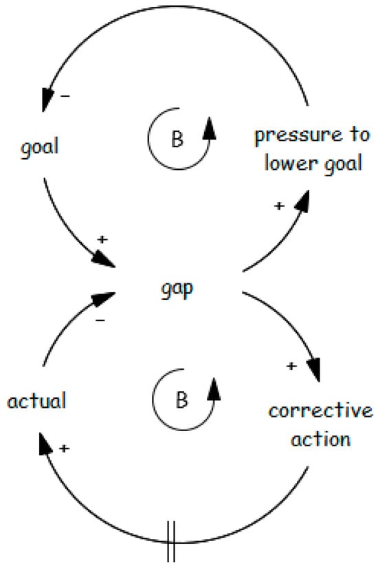 A key question is why governments fail to take decisive action to block illegal wells and enforce stricter penalties. This can be explained by the “drifting goals” archetype (Figure 14). When there is a gap between desired and actual water withdrawal, authorities have two options: take action to meet the goal or lower the goal to align with current realities. Often, the goal is adjusted downward due to implementation challenges or socio-economic and political concerns [50,102,103,104].