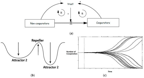 Path dependence. (a) Path-dependence structure for collective action. (b) A system with two stable states (attractors) and one unstable state (repeller). You can think of it like a ball on a landscape with two valleys and a hill in between. If the ball is placed anywhere on the hill (the repeller), even a small push will cause it to roll down into one of the valleys (the attractors). Once in a valley, the ball stays there unless it is pushed hard enough to cross the hill again. This shows how the system can settle into different stable outcomes depending on where it starts or what disturbances it experiences. (c) Behavior of the system adopted from Sterman [12]. Starting from nearly identical initial conditions, small differences get amplified over time, leading the system toward very different outcomes—either high cooperation or low cooperation.