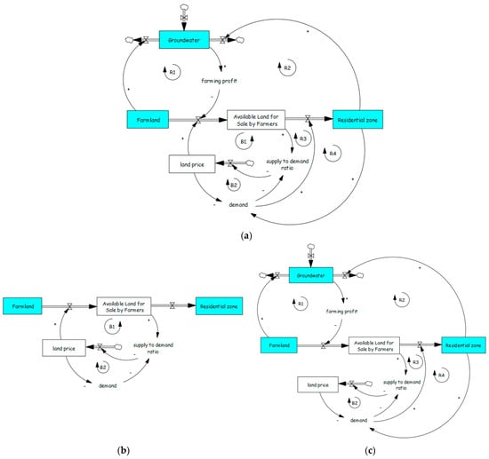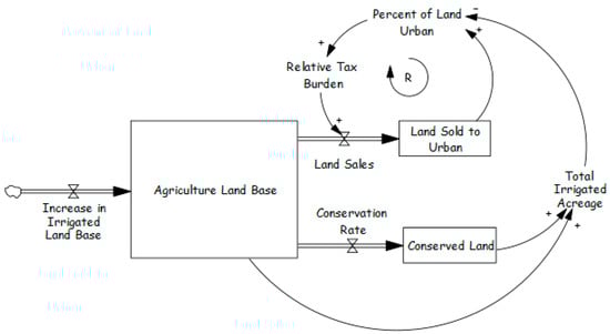 Water is one of the most frequently modeled topics in SD. For instance, a Web of Science search for “System Dynamics” AND “Water” yields more than 3300 papers. A comprehensive review of all such studies was beyond the scope of this research; therefore, we narrowed our focus. We began by identifying foundational models that represent the relationship between groundwater and irrigated land. Our review identified four generic structures and archetypes [45,46,47] commonly used to describe social groundwater system behavior: Limits to Growth, Predator–Prey Dynamics, the Tragedy of the Commons, and Oscillatory Behavior due to Delays.