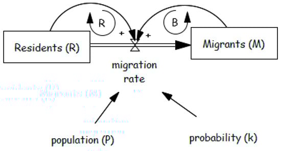 In CLD and SFD, a positive polarity (“+”) indicates that two connected variables move in the same direction—when one increases, the other increases as well, and vice versa. A negative polarity (“−”), by contrast, implies an inverse relationship—when one variable increases, the other decreases. These relationships may be linear or nonlinear; that is, changes in one variable may lead to proportional or disproportionately large or small changes in another, depending on thresholds, saturation effects, or other nonlinear mechanisms. Feedback loops formed by these links are classified as either reinforcing (R), which amplify deviations and drive exponential growth or decline, or balancing (B), which resist change and promote system stability. Temporal delays, commonly denoted by double slashes (//), represent lags between cause and effect that can obscure feedback dynamics [59].
