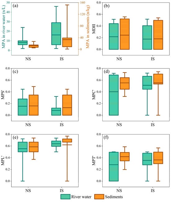 Statistical characteristics of MPA and MDII indices in river water and sediments of the PRE region: (a) MPA; (b) MDII; (c) MPS’; (d) MPC’; (e) MPL’; (f) MPT’. (The box represents the interquartile range (25th–75th percentiles), the horizontal line indicates the median, and the whiskers represent the maximum and minimum values. A Mann–Whitney U test was conducted to assess differences between MPA and MDII. No significant differences (p > 0.05) were found between NS and IS, nor between river water and sediments.)