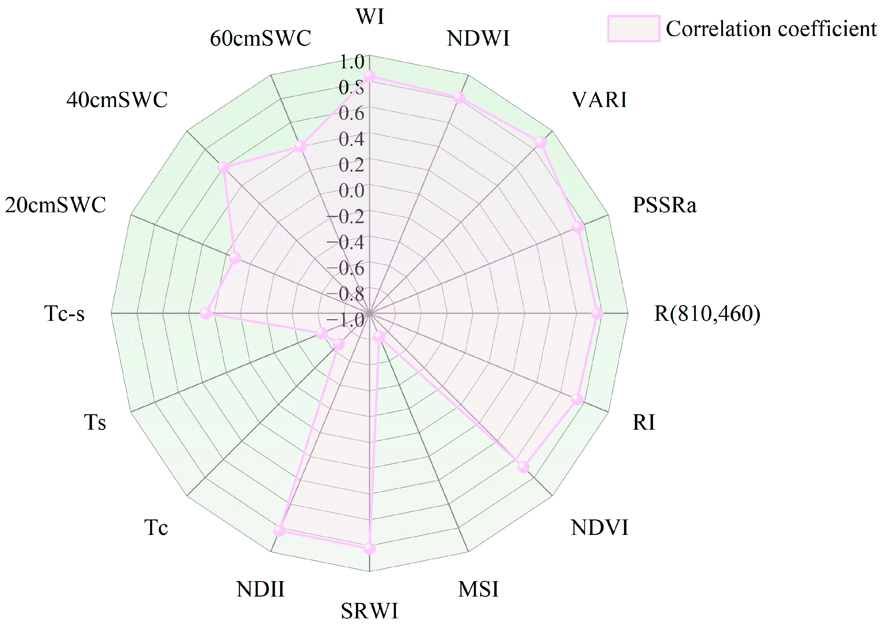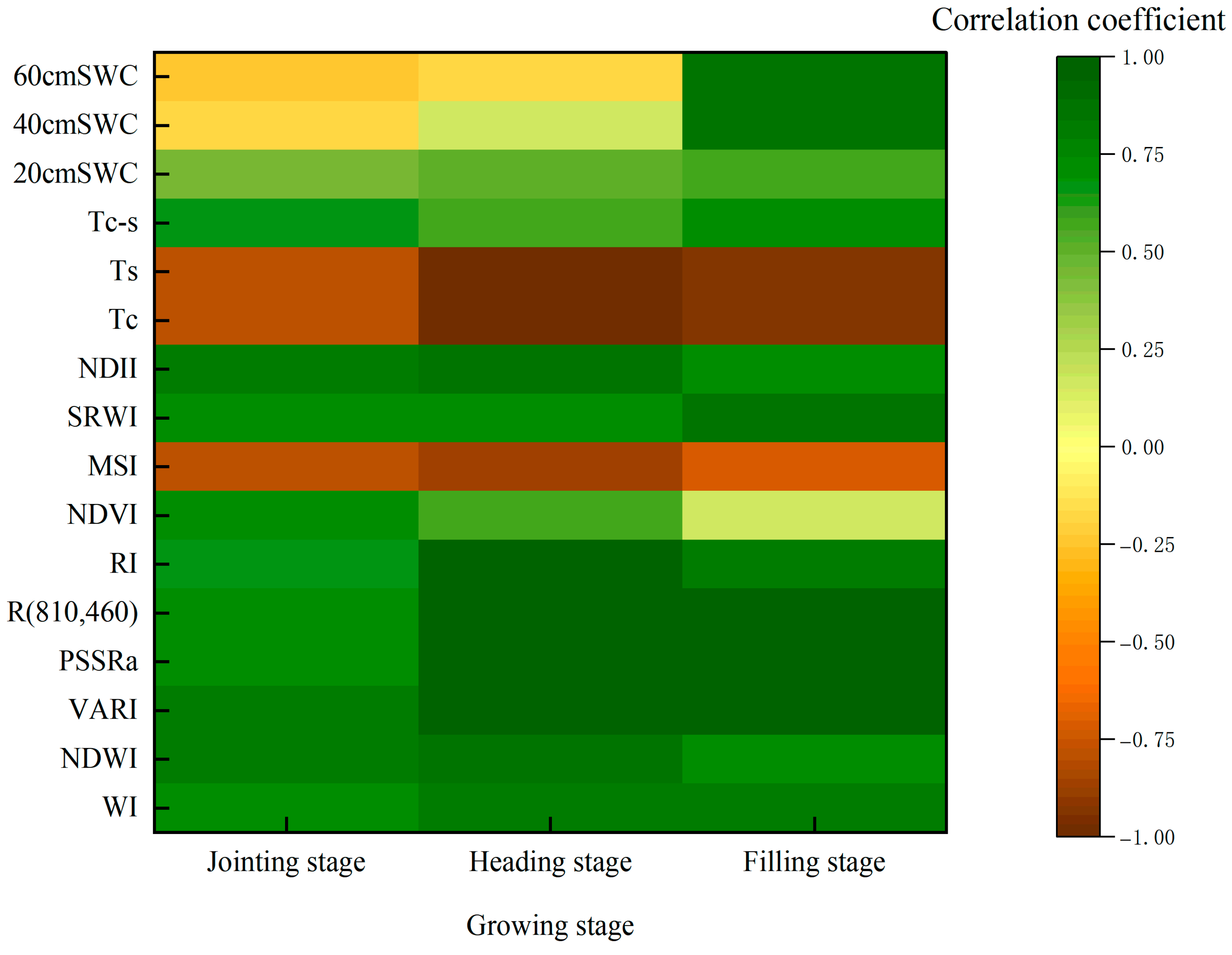 3.3. Correlation Between Winter Wheat Plant Water Content and Influencing Factors Across Growth Stages