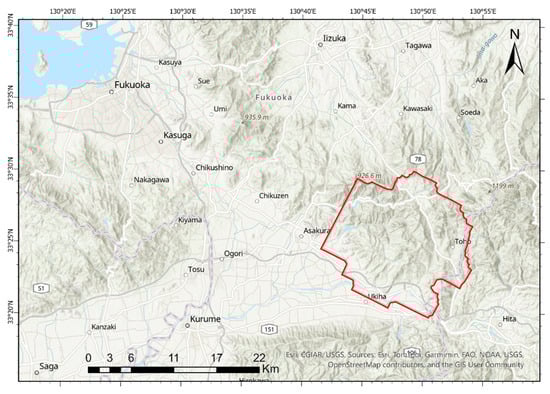 The study area spans approximately 242.94 km2 and is situated in the southeastern part of Fukuoka Prefecture, encompassing portions of Asakura City, Ukiha City, and Toho Village (Figure 1). This region was severely impacted by widespread slope failures and debris flows triggered by intense rainfall on 5 and 6 July 2017 [14].
