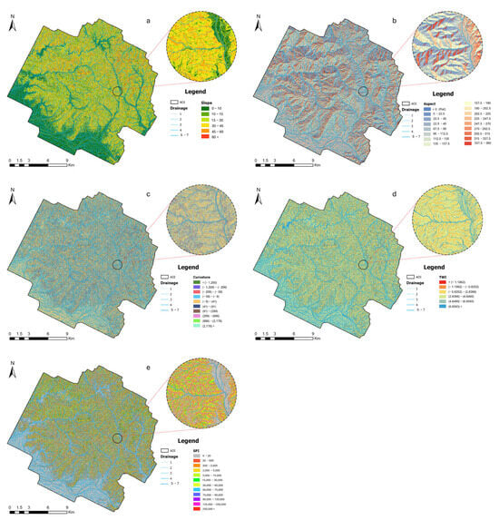 Illustrates the classified terrain-related conditioning factors where (a) Slope, (b) Aspect, (c) Curvature, (d) TWI, and (e) SPI.