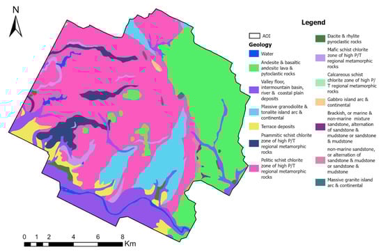 The geological setting and physical characteristics of surface sediments play a critical role in determining the spatial distribution and likelihood of slope failures. To evaluate the potential for sediment mobilization, a lithological map at a 1:200,000 scale—published by the Geological Survey of Japan—was utilized in this study (Figure 4). This map illustrates the major sediment types present in the study area, each of which carries distinct implications for landslide susceptibility.