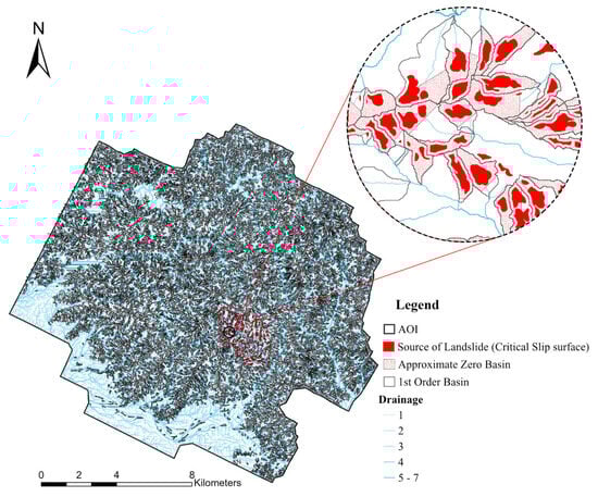 First-order drainage catchments represent the smallest units within a stream network and are typically situated in headwater regions (Figure 3c). These catchments often consist of small, steep, and hydrologically active sub-basins (0 basin) that play a critical role in sediment transport and slope failure processes [27]. Approximate 0-order basins are located within 1st-order drainage catchments and are characterized as small, unchanneled hollows situated upslope of defined channels (Figure 3c). These areas are widely recognized as key source areas for shallow landslides and debris flows due to their tendency to accumulate colluvial material and subsurface water [13].