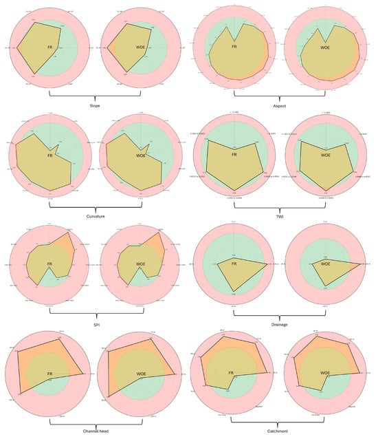 Despite relying on different mathematical formulations, the interpretations of Frequency Ratio FR and WOE are largely consistent. In general, positive values ( or ) indicate that a specific class of a conditioning factor is positively associated with landslide occurrences, suggesting higher susceptibility. Conversely, negative values ( or ) imply a lower likelihood of landslide occurrence, indicating lower susceptibility. A neutral value ( or ) denotes no significant relationship.