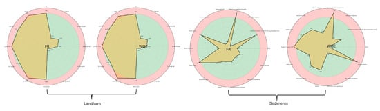 The landform raster captures key geomorphological features such as ridges, slopes, valleys, and hollows, providing a spatial representation of terrain types associated with varying erosion and deposition dynamics (Figure 3d). In general, lower landform values correspond to elevated features such as ridges or peaks, whereas higher values typically represent depressions or valley bottoms [28].