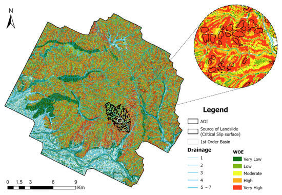 The results indicate that both the FR and WOE methods effectively identified areas with a high risk of mass movement in the upper catchment. Nearly all the critical slip surfaces or source zones of mass movement are located within the ‘High’ to ‘Very High’ susceptibility classes, demonstrating the reliability of these methods in delineating hazardous zones.