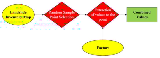 Multivariate methods differ fundamentally from bivariate approaches. While bivariate techniques evaluate the relationship between landslide occurrence and each conditioning factor class independently, multivariate methods consider all contributing factors simultaneously to develop a best-fit model that distinguishes landslide-prone areas from stable zones. To support this analysis, a preprocessing algorithm was developed (Figure 10).