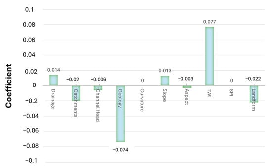 Each coefficient quantifies the strength and direction of the influence of the corresponding factor on landslide susceptibility. A positive coefficient indicates a direct relationship, meaning that an increase in the value of the factor increases the probability of landslide occurrence. Conversely, a negative coefficient suggests an inverse relationship, where higher values of the factor reduce landslide likelihood.
