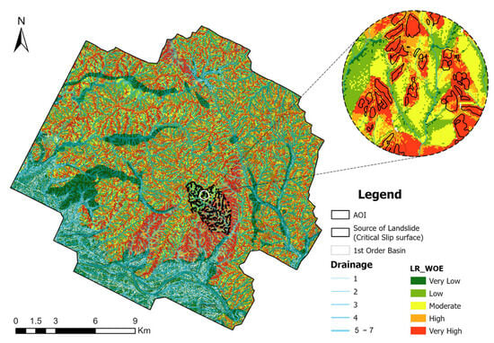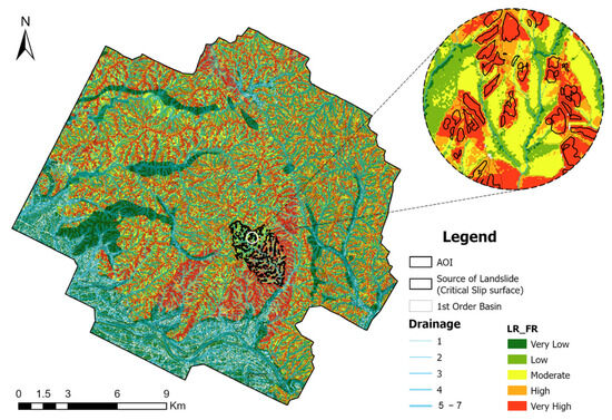 Figure 13 and Figure 14 clearly demonstrate that integrating LR with FR and WOE enhances the predictive performance of the model. As shown, the critical slip surfaces within the approximate 0-order basins are predominantly located in the ‘High’ to ‘Very High’ susceptibility zones, validating the effectiveness of the integrated approaches.