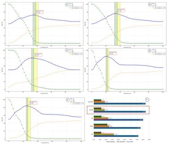 Performance metrics (Success Rate, False Alarm Rate, and Missed Alarm Rate) plotted against threshold (TH) values. The red dashed line marks the threshold at which SR is maximized. The green and yellow shaded areas represent threshold ranges of +10% and +25% from the optimal threshold, respectively. (A) Result of FR, (B) Result of WOE, (C) Result of LR, (D) Result of LR + FR, (E) Result of LR + WOE, and (F) Comparison of the results obtained from all methods.