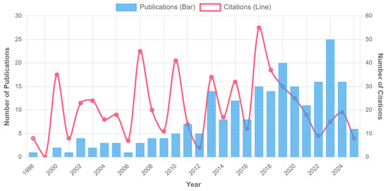 Based on the bibliometric analysis of soil erosion and lake water environment research in China from 1998 to 2025, this study found that the variation characteristics of annual publication volume and literature citation volume profoundly reflected the scientific research attention, academic influence and policy response characteristics in this field. The ‘citations’ in this paper refer to the total number of citations of 225 target documents cited by other documents in the core collection of Web of Science (which refers to the total number of citations of papers published in a specific period (such as 1998–2007) during the entire research period (1998–2025)). Through the analysis of 225 documents and their 585 citations (Figure 1), it is shown that the research evolution has a significant correlation with the stage of water environment governance in China [2].