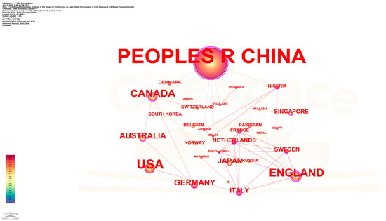 The analysis of the national cooperation network, based on CiteSpace, shows that China occupies a dominant position in the field of soil erosion and lake water environment research (Figure 3, Table 1). From the perspective of national data statistics (national data.xlsx), China’s publication volume is as high as 209, and the betweenness centrality is 1.0, showing absolute academic influence. Although countries such as the United States (23), the United Kingdom (14) and Canada (12) have certain participation, the intensity of cooperation is relatively limited. Among them, Canada (betweenness centrality 0.44) and Germany (0.11) have formed a relatively stable scientific research cooperation relationship with China.