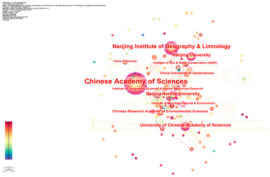 The analysis of the institutional cooperation network based on CiteSpace shows that the research on soil erosion and lake water environment in China presents a clear ‘core-edge’ structural feature (Figure 4) [17,18]. From the perspective of institutional data statistics (Table 2), the Chinese Academy of Sciences system occupies an absolute core position. Among them, the Chinese Academy of Sciences (93 papers, betweenness centrality 0.7), as the highest-level research institution, integrates the main scientific research forces through its nationwide research institutes. Institutions such as the Nanjing Institute of Geography and Lakes (32 articles, 0.29) and Beijing Normal University (13 articles, 0.31) formed a secondary research cluster and formed a stable cooperation network.
